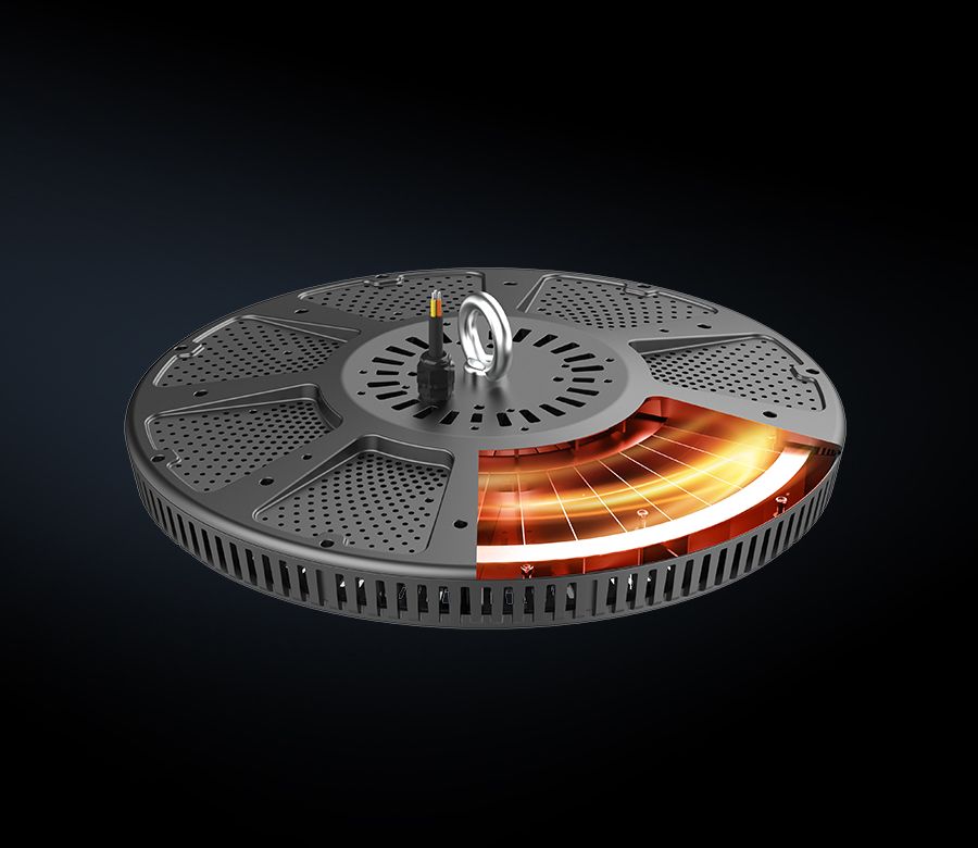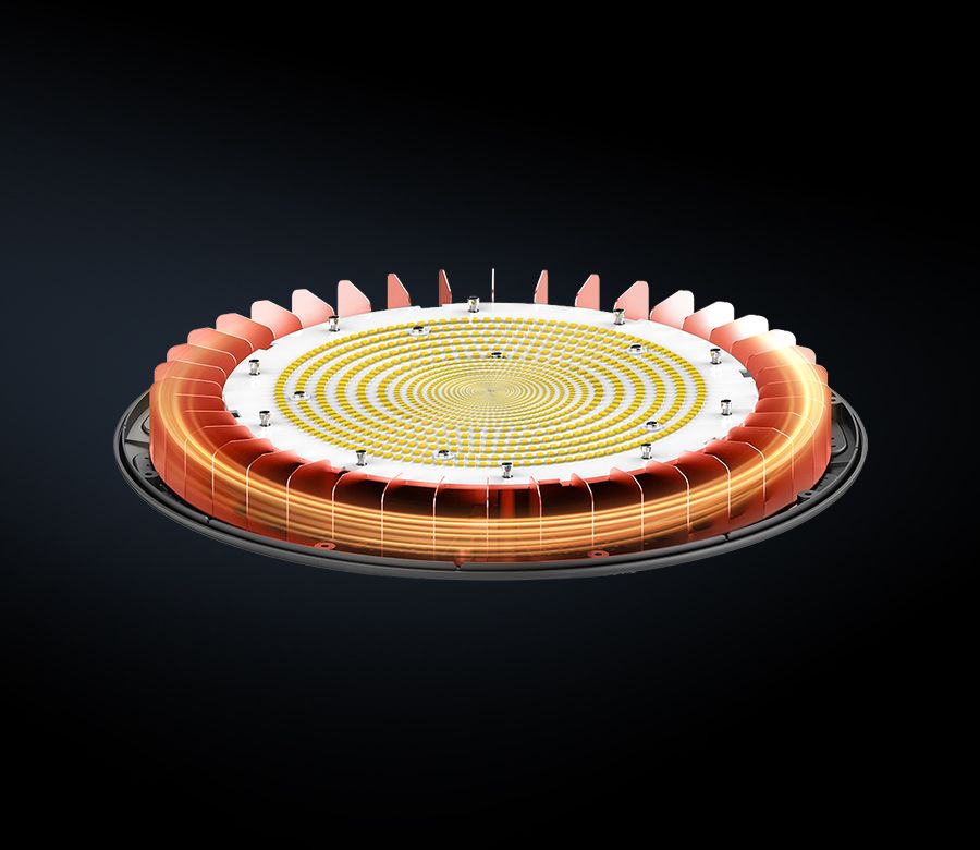 基于热空气向上流动的原理,底部和灯体周围设计了空气动力学的进气口。传入的冷空气在灯体中循环以冷却,并通过在外部和顶部设计的散热器排放。