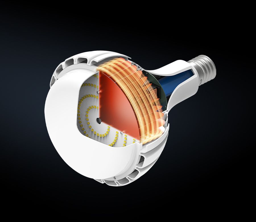 使用热空气向上流的原理,灯的腔体容易在使用过程中高温。灯泡的简化设计是在灯主体底部设计的。设计了几个空气动力学进气孔。多次散热管通过顶部的空气出口排放大量热空气,以实现高性能散热
